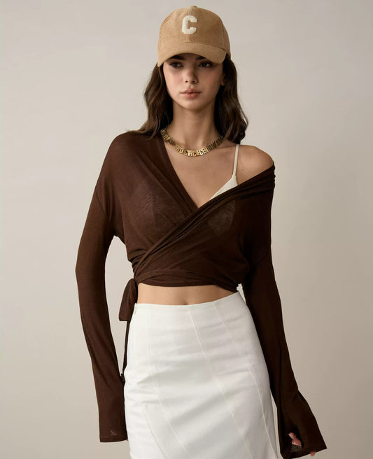 Tencel-Linen V-Neck Tie Blouse with Bell Sleeves